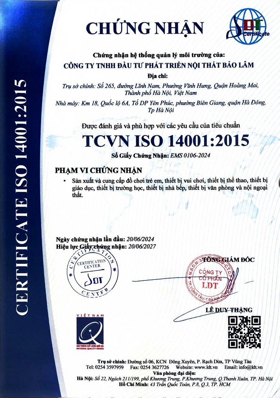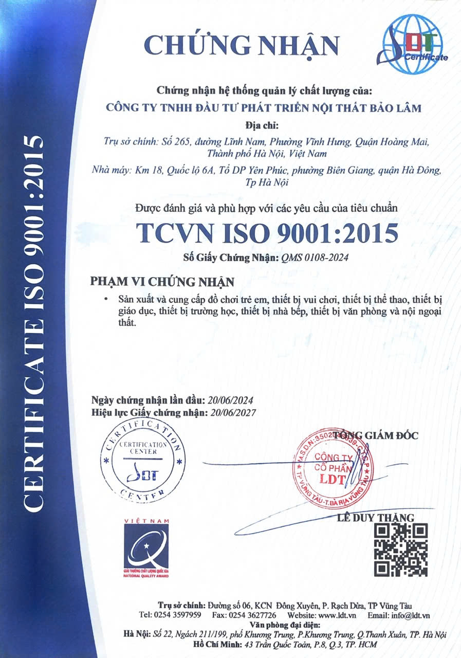 - Năm 2017: Nhận chứng chỉ ISO 9001:2015 do Trung Tâm Chứng Nhận Phù Hợp - Quacert cho lĩnh vực Sản xuất và Cung cấp Nội thất Trường học, gia đinh, văn phòng, bệnh viện... cấp lần đầu ngày 17.01.2017, đánh giá chứng nhận lại vào ngày 10/02/2023.