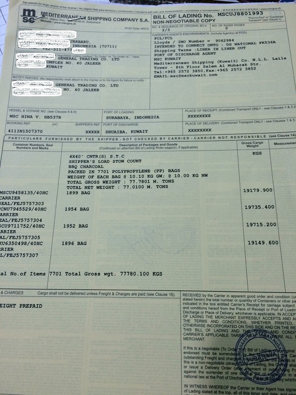 BL nhập khẩu than trắng từ Indonesia của công ty tôi