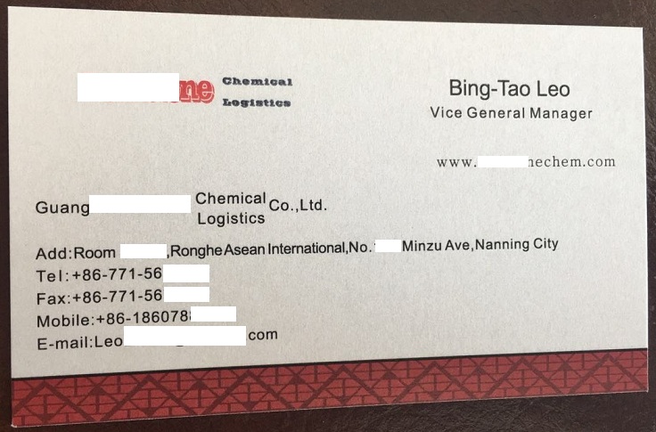 Tôi là ██████████ Leo, quý vị có thể gọi tôi là Leo, Phó giám đốc Công ty ██████████ Chemical and Logistic Co Ltd có trụ sở tại thành phố Nam Ninh, tỉnh Quảng Tây, Trung Quốc. Nhà máy của chúng tôi nằm cách cảng Phòng Thành 11km, rất thuận tiện cho việc vận chuyển hàng hóa.