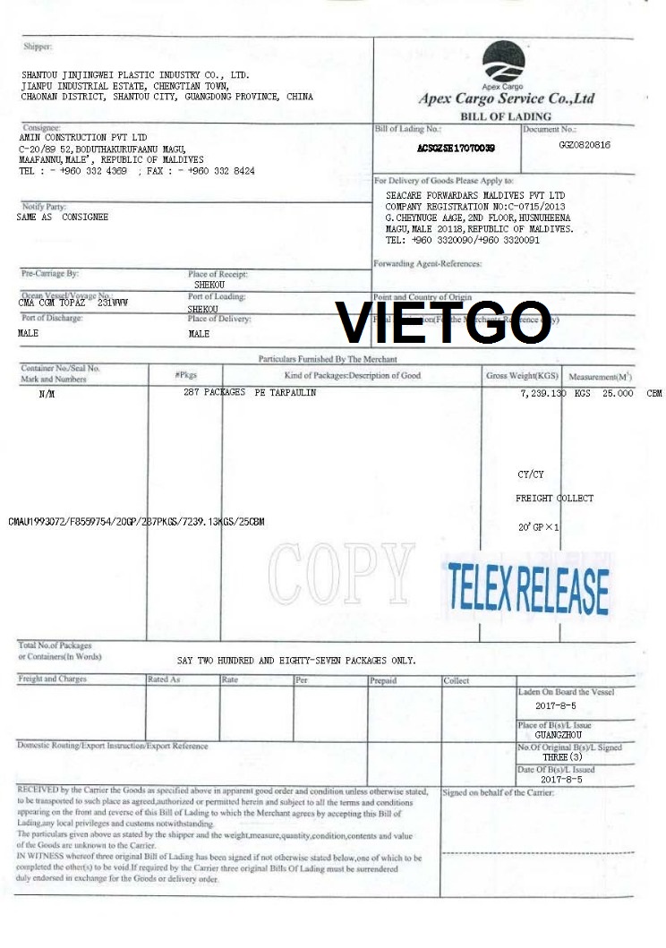 Báo giá: CIF cảng Male, Maldives