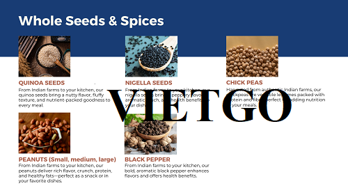 Các mặt hàng chủ lực có thể kể đến hạt tiêu đen, hạt thìa là, hạt rau mùi, hạt cỏ cà ri, hạt thì là Ai Cập, hạt nigella, hạt chia, vừng, đậu gà, đậu phộng, hạt quinoa… Ngoài ra, công ty còn cung cấp các loại gia vị đặc trưng như quế, đinh hương, hoa hồi, bột ớt, bột nghệ, bột rau mùi cùng sản phẩm từ hành và tỏi sấy khô. Sự đa dạng này cho thấy khả năng bao quát chuỗi cung ứng nông sản của công ty, đồng thời đáp ứng linh hoạt nhiều phân khúc thị trường. Công ty không chỉ chú trọng đến việc mang lại nguồn hàng đạt chuẩn quốc tế mà còn quan tâm đến lợi ích lâu dài cho người nông dân và đối tác.