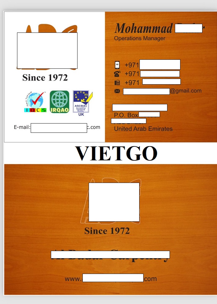 Ông Mohammad ██████████ đã liên hệ với VIETGO và trao đổi về dự án nhập khẩu ván MDF của mình. Ông Mohammad chia sẻ: “██████████ được thành lập vào năm 1972, công ty của chúng tôi là một doanh nghiệp tư nhân chuyên cung cấp dịch vụ thiết kế nội và ngoại thất cho các công trình xây dựng. Chúng tôi đã hoàn thành nhiều dự án tại tất cả các Tiểu vương quốc Ả Rập Thống nhất cũng như ở nước ngoài và luôn nhận được sự hài lòng từ phía khách hàng quý giá. Chúng tôi tin rằng cam kết về hiệu suất, giao hàng đúng hẹn, và các điều khoản tài chính hấp dẫn đã tạo nên lợi thế cạnh tranh cho công ty trên thị trường, mang đến cho khách hàng sự đảm bảo mà họ xứng đáng được nhận.