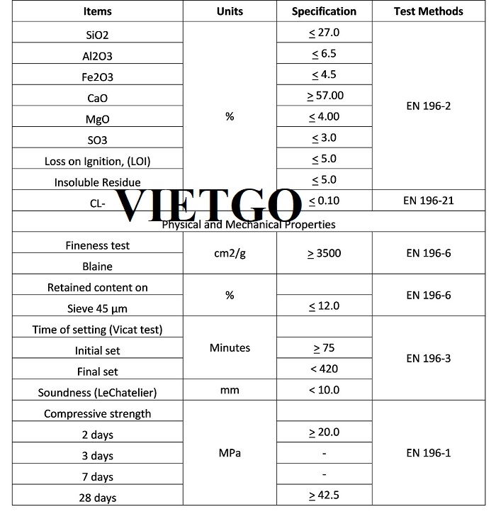 Hình ảnh thông số kỹ thuật tham khảo xi măng mác 42.5N