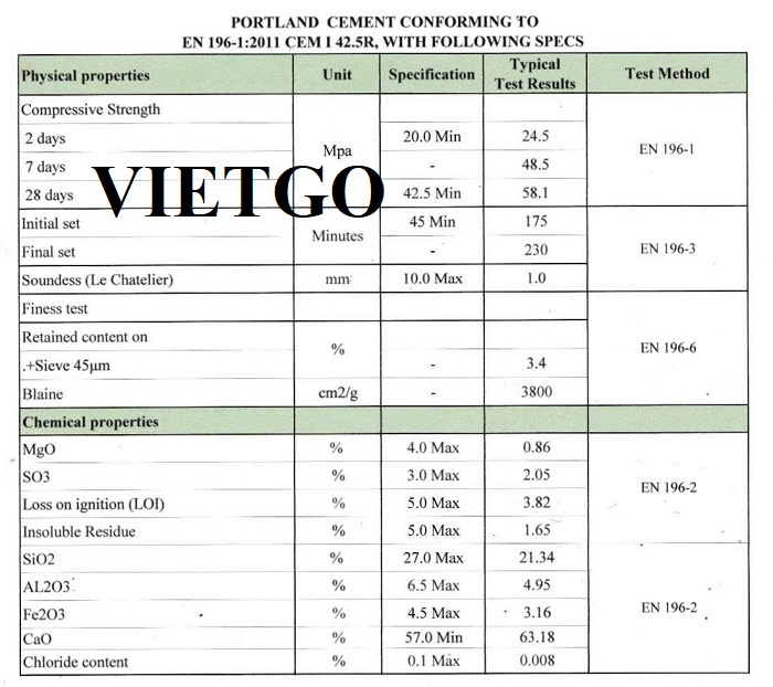 Hình ảnh thông số kỹ thuật tham khảo xi măng mác 42.5R