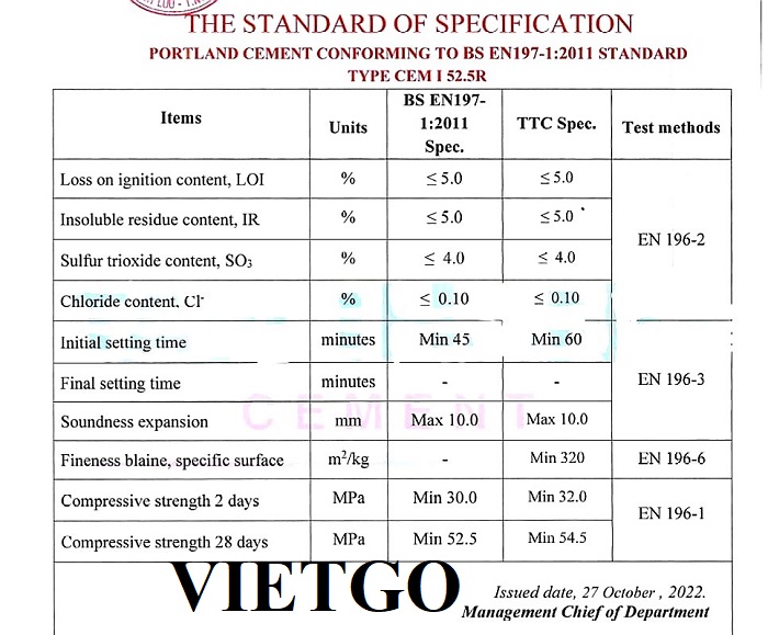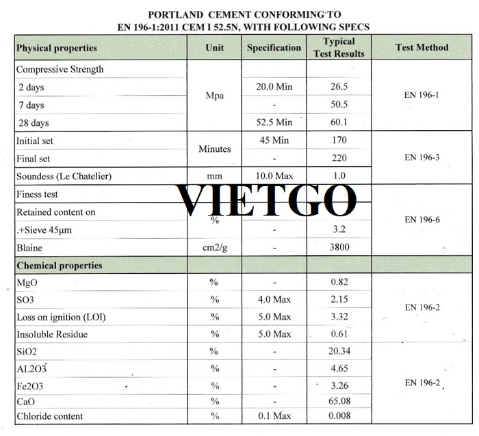 Hình ảnh thông số kỹ thuật xi măng mác 52.5N tham khảo