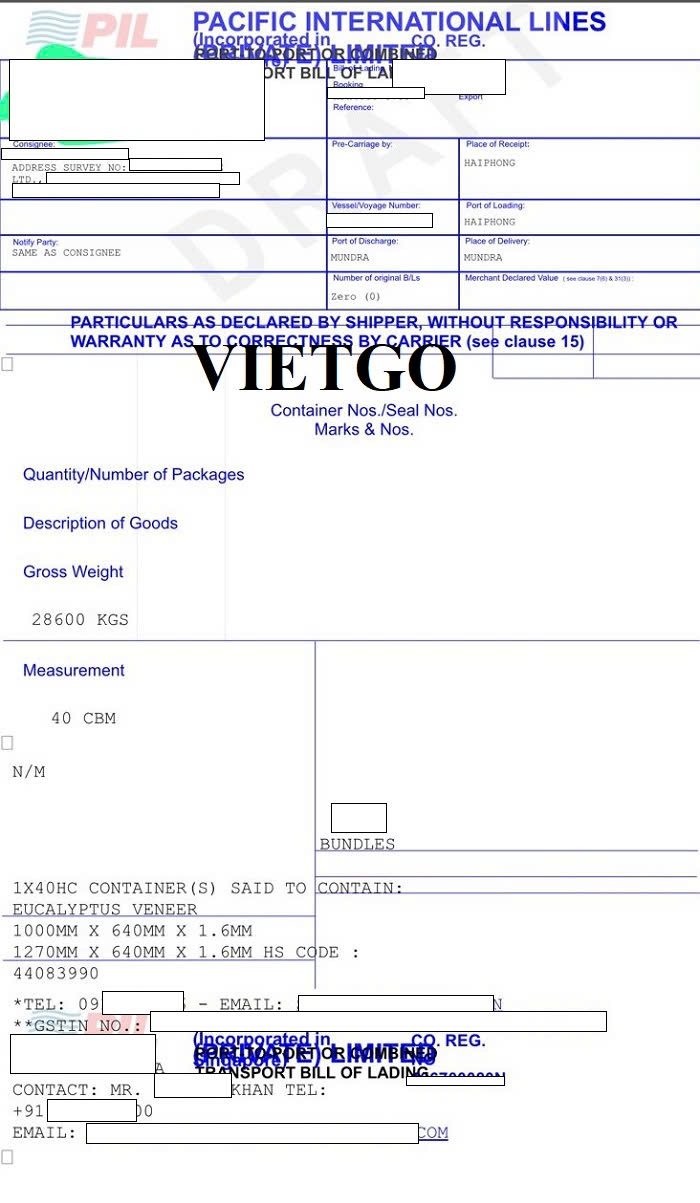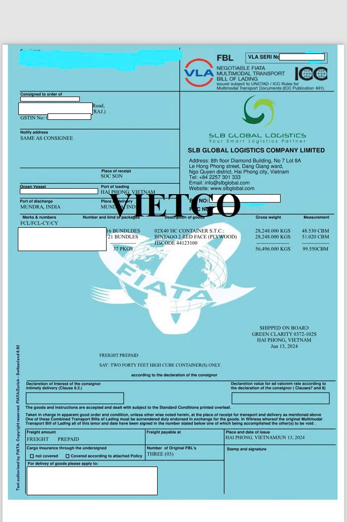 Hình ảnh bản vận đơn nhập khẩu gỗ dán từ Việt Nam của công ty vị khách hàng