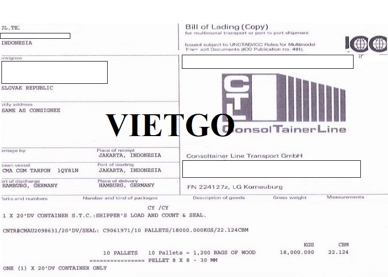 Hình ảnh bản vận đơn nhập khẩu viên nén mùn cưa công ty đã tiến hành nhập khẩu từ Indonesia tới thị trường Đức