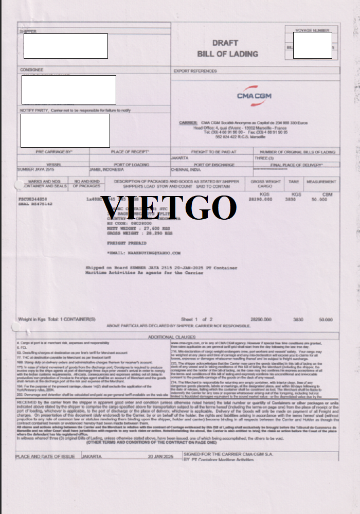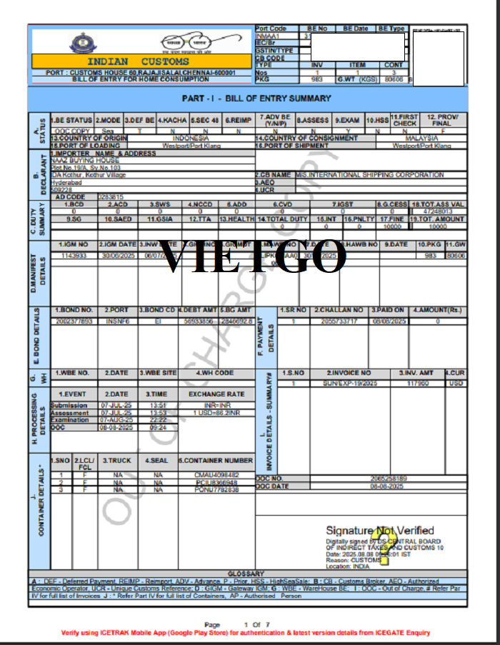 Dưới đây là một số hình ảnh phiếu nhập cảnh và bản vận đơn nhập khẩu hàng hóa từ Indonesia vào ngày 20/1/2025 của vị khách hàng: