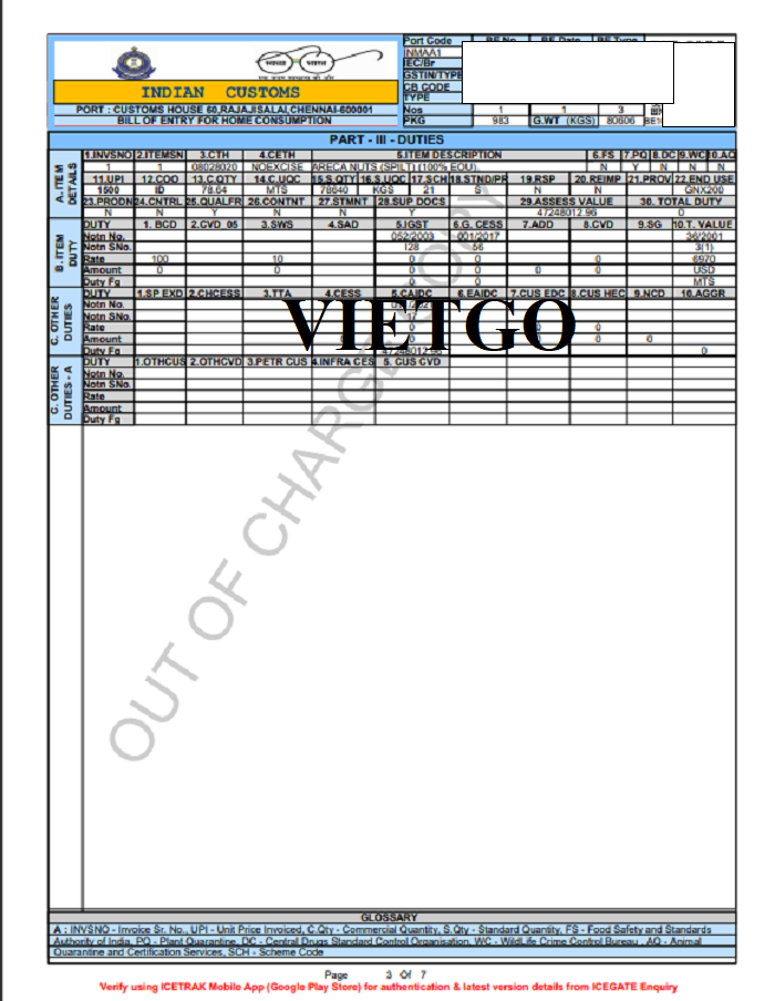 Hình ảnh phiếu nhập cảnh hàng hóa từ Indonesia của vị khách hàng