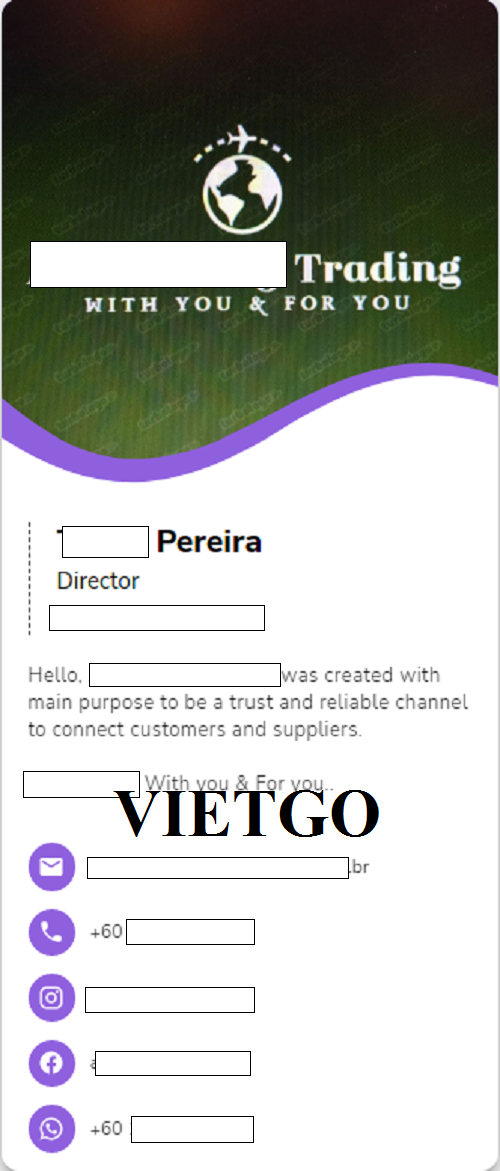 Ông Pereira hiện đang giữ chức vụ giám đốc của ██████████ – công ty hoạt động chính trong lĩnh vực thương mại hàng hóa quốc tế. Với lượng khách hàng chính đến từ Brazil, ông Pereira cam kết cung cấp tới khách hàng của mình hầu hết các loại sản phẩm từ dệt may, thiết bị y tế tới lương thực, dầu ăn và nhiều sản phẩm kim loại khác. Với mục tiêu mở rộng mạng lưới khách hàng từ Brazil tới các quốc gia khác trong khu vực châu Mỹ như Argentina và Colombia, ông Pereira đang đầu tư thời gian và công sức vào việc tìm kiếm và hợp tác những nhà cung cấp uy tín tại khu vực châu Á. Có thể nói với quy mô hoạt động vừa và nhỏ, công ty của ông Pereira có thể linh hoạt và đáp ứng được rất nhiều yêu cầu đối với các sản phẩm khác nhau của khách hàng.