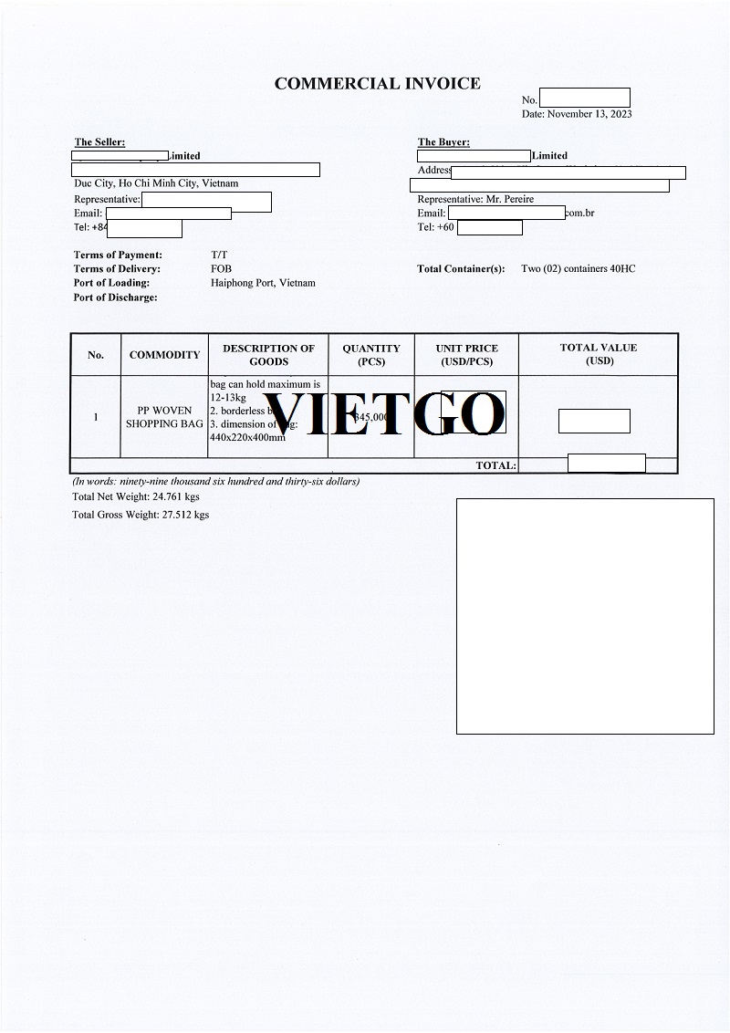 Hóa đơn thương mại lô hàng túi PP của vị khách hàng