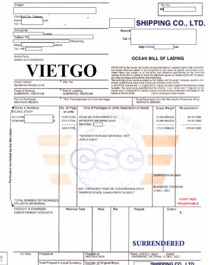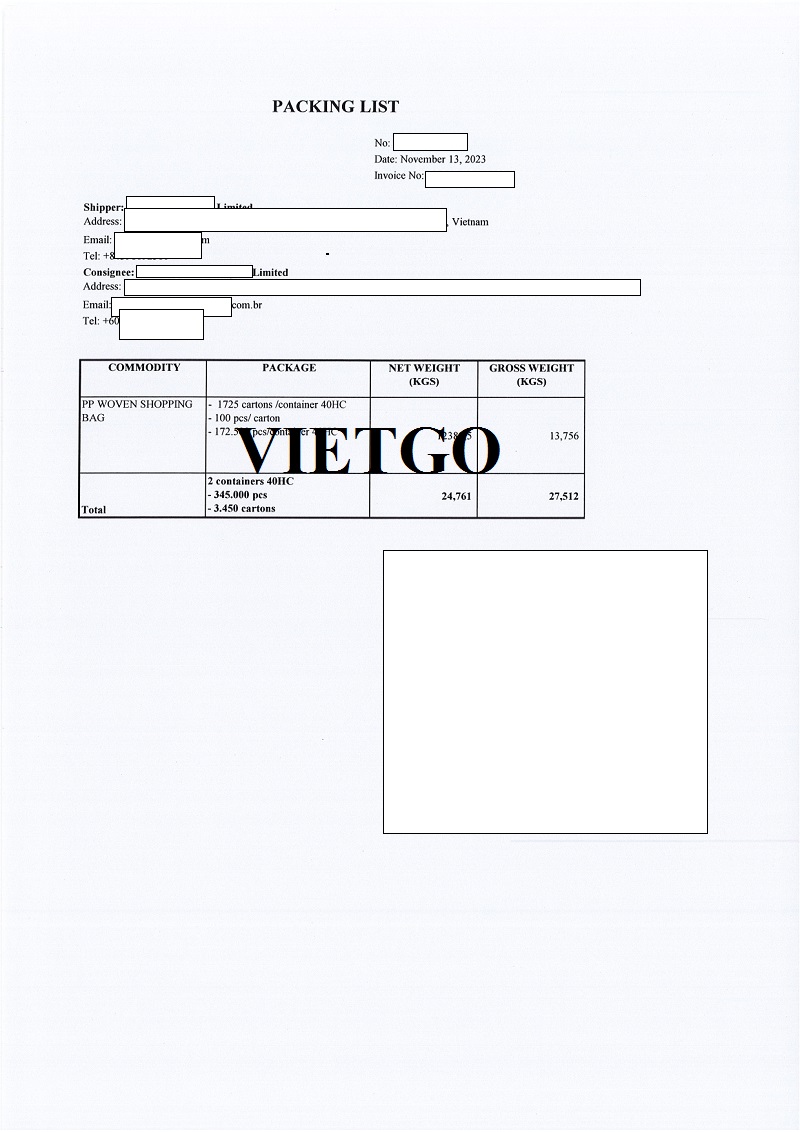 VIETGO xin gửi tới Quý vị thông tin đơn hàng nhập khẩu túi PP của ông Pereira – vị khách hàng người Brazil.
