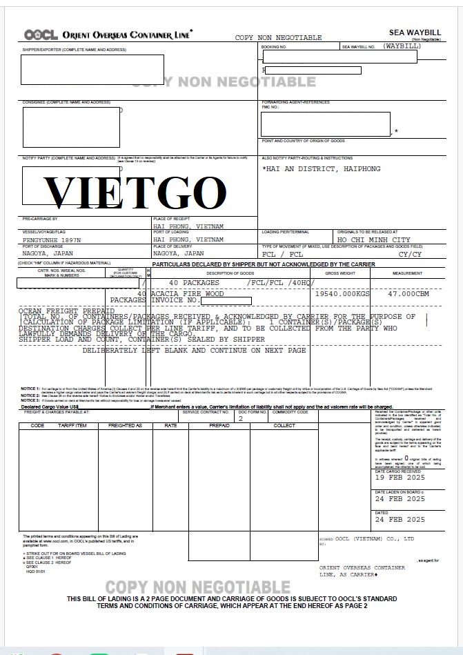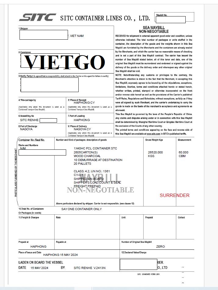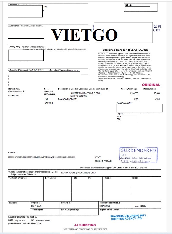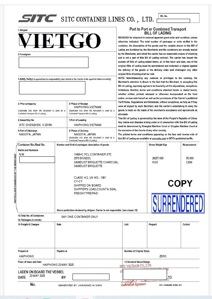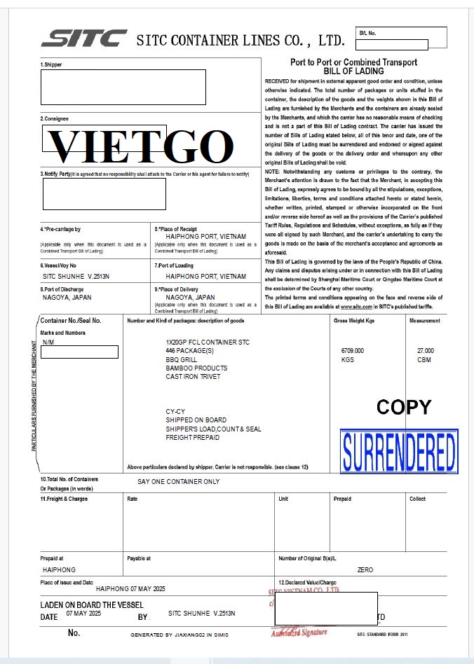 Hình ảnh bản vận đơn nhập khẩu các sản phẩm củi gỗ, than củi, mây tre đan công ty khách hàng tại Nhật đã thực hiện