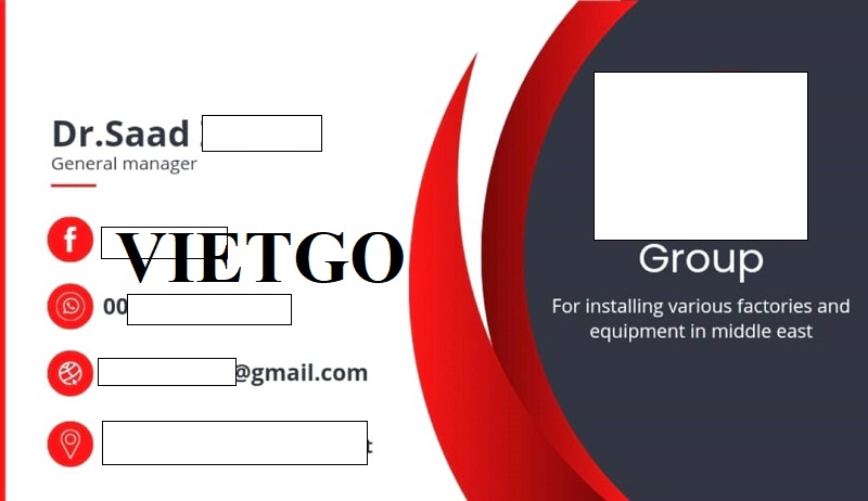 Liên hệ với VIETGO, vị khách hàng mong muốn có cơ hội được kết nối với các nhà cung cấp tiềm năng tại đây. Quý nhà cung cấp nào có thể đáp ứng cho đơn hàng nhập khẩu của ông Saad vui lòng liên hệ với vị khách hàng theo thông tin được cung cấp dưới đây.