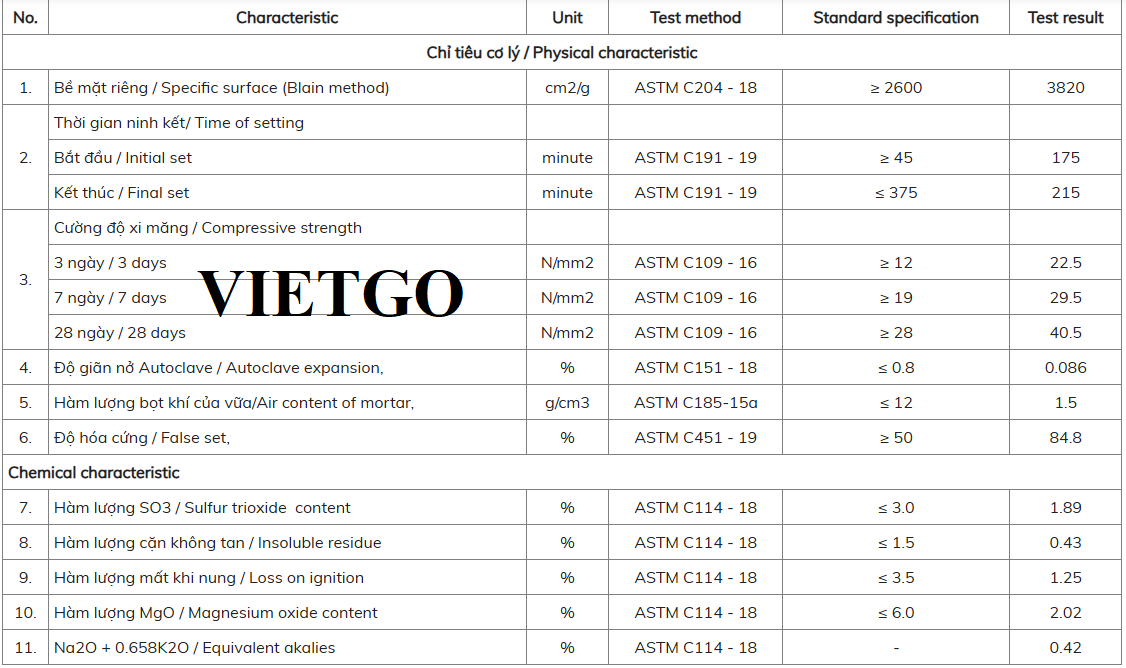 Yêu cầu: Xi măng Portland ASTM 150 loại 1 có chất lượng tốt