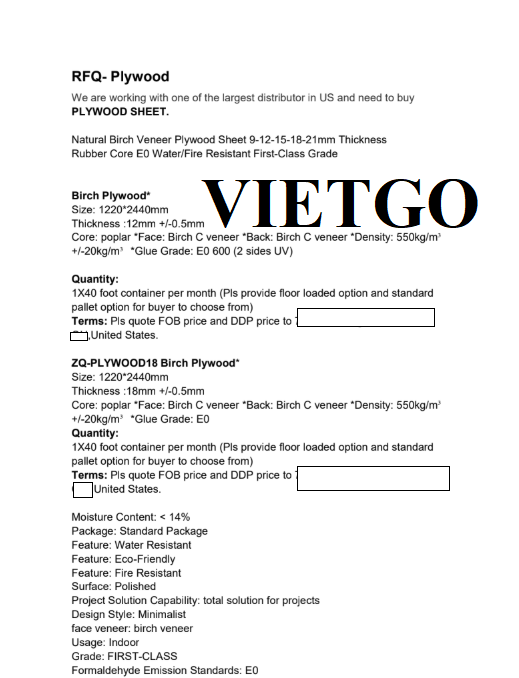 Vừa qua, VIETGO đã có cuộc trò chuyện và trao đổi chi tiết với vị khách hàng tiềm năng – cô Eva về sản phẩm gỗ dán. Cô Eva – đại diện cho công ty ██████████ tại Hoa Kỳ đang tìm kiếm các nhà cung cấp tiềm năng cho sản phẩm gỗ này.