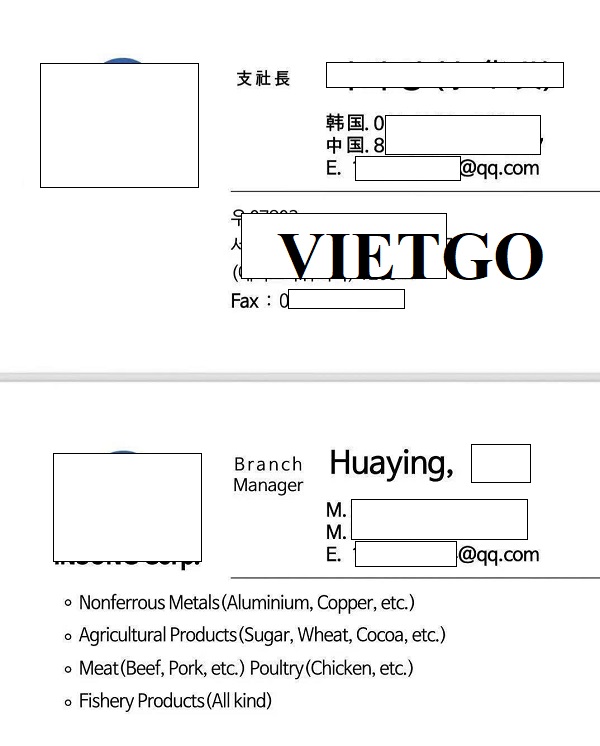 Vừa qua, ông Huaying ██████████ đã có cuộc thảo luận với VIETGO và bày tỏ mong muốn được nhập khẩu viên nén mùn cưa tới thị trường Hàn Quốc và Trung Quốc. Ông là người đại diện của công ty ██████████, công ty của ông Huaying được biết đến là doanh nghiệp hoạt động trong lĩnh vực cung cấp các sản phẩm kim loại màu, sản phẩm nông nghiệp và thủy sản.
