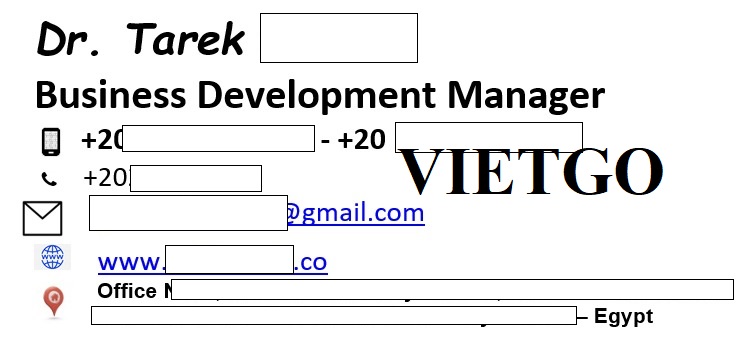 Ông Tarek ██████████ - vị khách hàng của VIETGO lần này đại diện mua hàng đến từ Ai Cập. Hiện tại ông là Quản lý phát triển doanh nghiệp của công ty ██████████, có trụ sở tại Ai Cập. Đây là doanh nghiệp chuyên kinh doanh các sản phẩm trong lĩnh vực y tế và phân phối đến các cơ sở chăm sóc sức khỏe tại Ai Cập, Trung Đông và châu Phi được thành lập vào năm 2003. Bên cạnh đó, công ty cũng hợp tác với các thương hiệu y tế nổi tiếng ở trong nước và quốc tế, nhằm đem đến các dịch vụ chất lượng nhất, an toàn nhất.