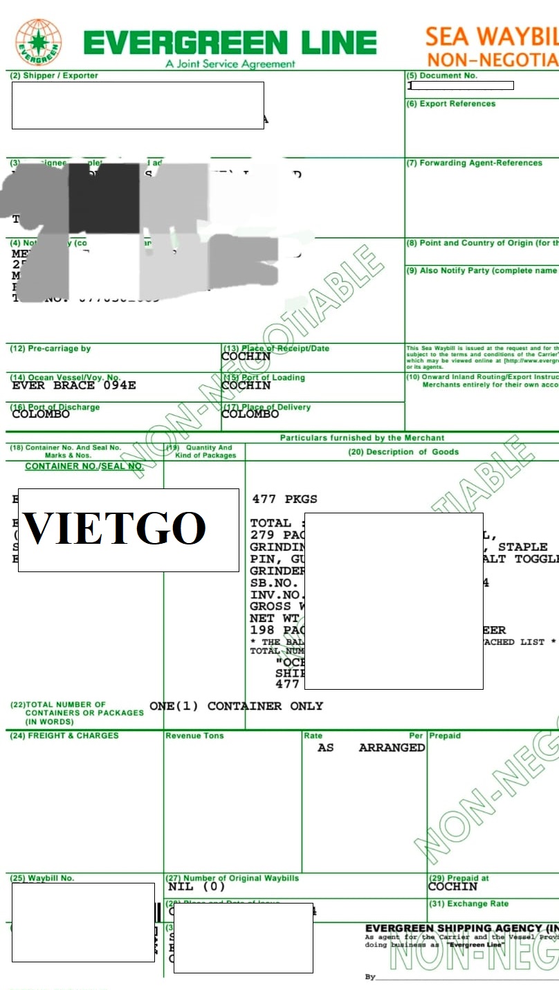 Hình ảnh bản vận đơn vị khách hàng xuất khẩu thành công 477 kiện sản phẩm Keo gỗ Fevicol, Đĩa mài, Dụng cụ bấm ghim, Ghim, Máy mài Dewalt từ Ấn Độ đến Sri Lanka