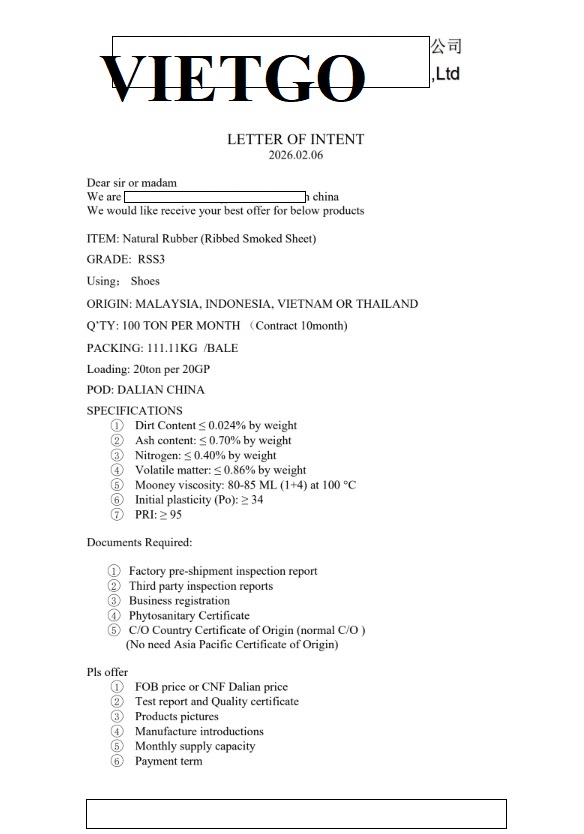 Số lượng: 100 tấn mỗi tháng (hợp đồng 10 tháng)