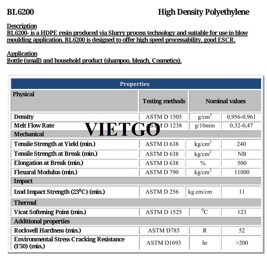 Loại: Hạt nhựa HDPE BL6200