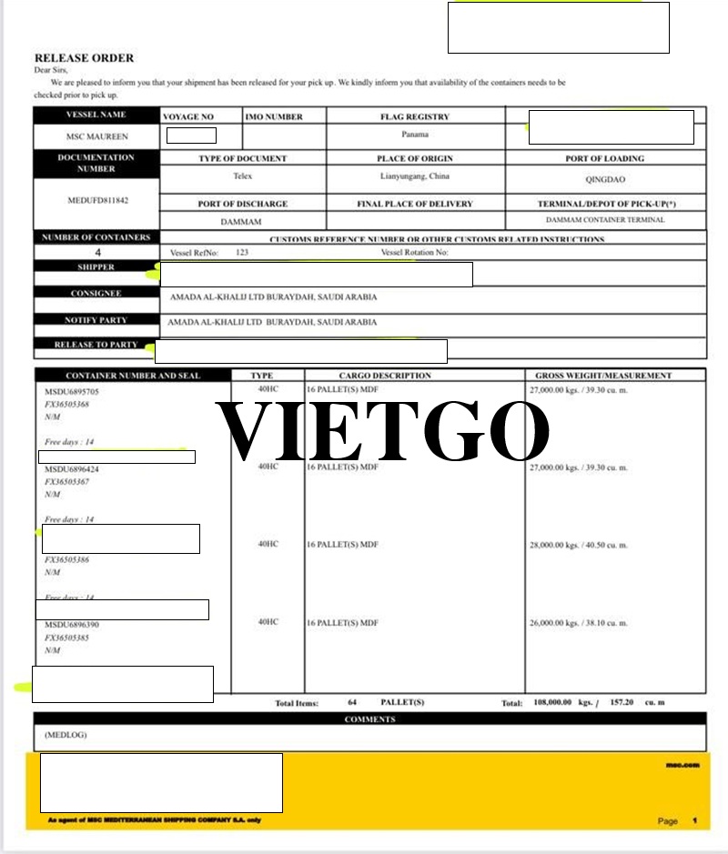 Hình ảnh bản release order của công ty vị khách hàng từ Trung Quốc