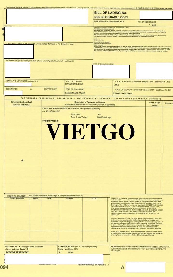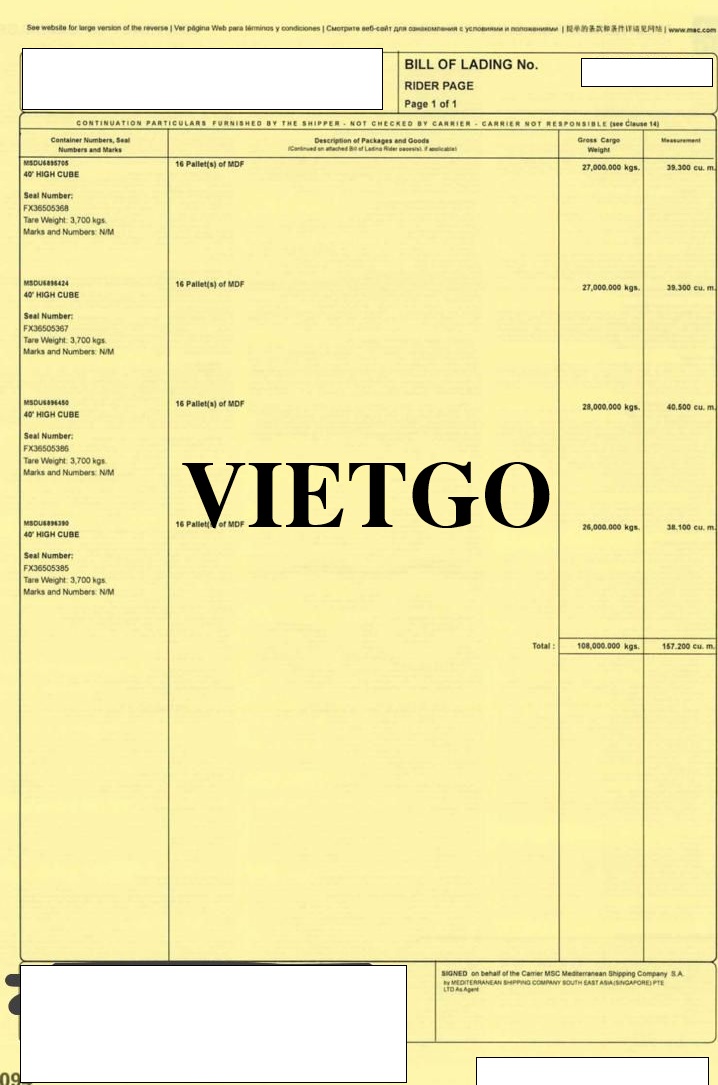 Hình ảnh bản vận đơn nhập khẩu ván MDF của công ty vị khách hàng từ Trung Quốc