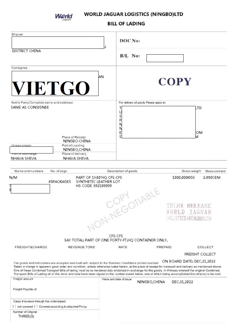 Hình ảnh bản vận đơn nhập khẩu lô hàng da từ Trung Quốc đến Ấn Độ công ty vị khách hàng đã thực hiện