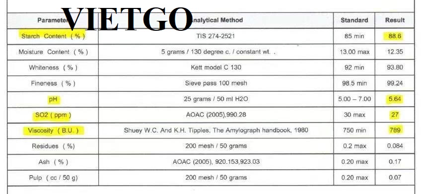Hàm lượng tinh bột: Tối thiểu 85%