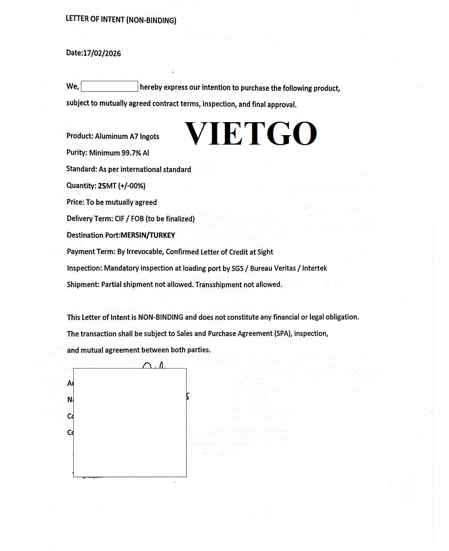 Ông Ibrahim – đại diện công ty ██████████ hiện đang cần tìm nhà cung cấp cho đơn hàng nhập khẩu thỏi nhôm A7 sang thị trường Thổ Nhĩ Kỳ nhằm phục vụ hoạt động kinh doanh của công ty ông.