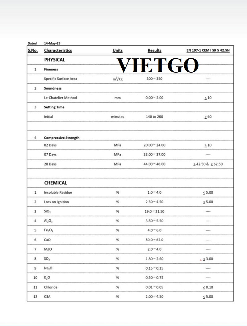 Yêu cầu: Xi măng Portland có chất lượng tốt, đáp ứng tiêu chuẩn xuất khẩu