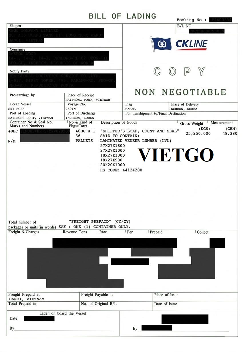 Hình ảnh bản vận đơn nhập khẩu gỗ dán LVL của công ty vị khách hàng từ Việt Nam