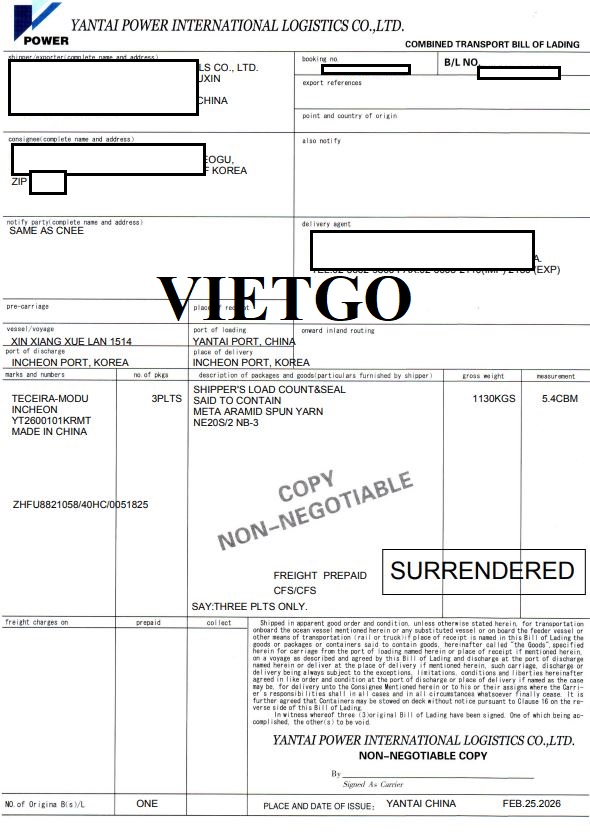 Hình ảnh bản vận đơn vị khách hàng xuất khẩu thành công sản phẩm sợi Aramid meta từ Trung Quốc đi Hàn Quốc vào ngày 25 tháng 02 năm 2026 vừa rồi