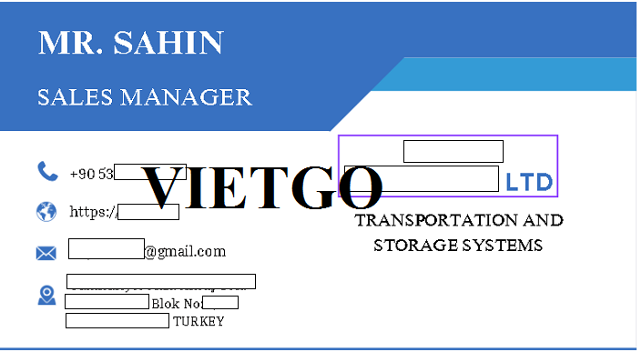 Ông Sahin - vị khách hàng của VIETGO lần này đại diện mua hàng đến từ Thổ Nhĩ Kỳ. Hiện tại ông đang là Quản lý kinh doanh của ██████████, có trụ sở tại Bursa, Thổ Nhĩ Kỳ. Đây vốn là công ty chuyên kinh doanh và xuất nhập khẩu các sản phẩm vận chuyển và lưu trữ như khung gầm, container, băng tải, toa tàu chở hàng,... Công ty chuyên sản xuất, thiết kế dự án cũng như cung cấp dịch vụ tư vấn cho khách hàng. Với bề dày lịch sử và truyền thống của mình, công ty đã tích lũy được nhiều kinh nghiệm trong kinh doanh và đã đạt được những bước tiến lớn đối với lĩnh vực dừa khô.