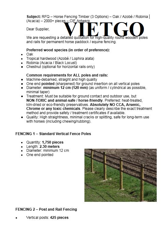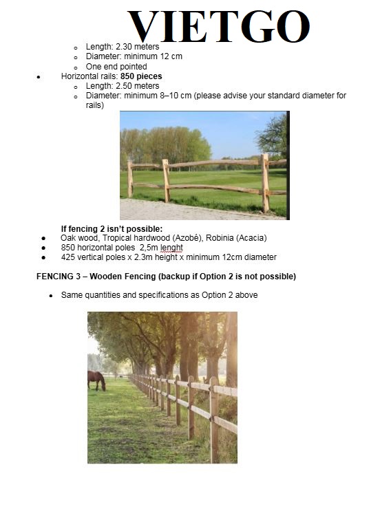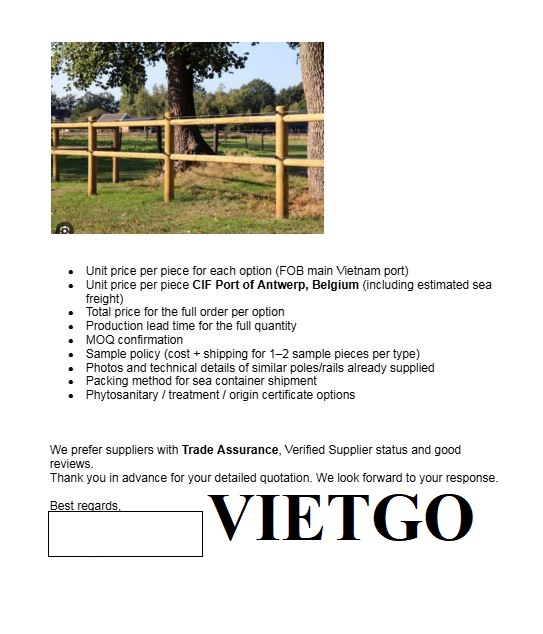 Chia sẻ về đơn hàng hiện tại, cô Elisabeth cần nhập khẩu sản phẩm cọc gỗ làm hàng rào cho trang trại nuôi ngựa của mình. Cô đã liên hệ cũng như trao đổi với Vietgo về đơn hàng và rất mong sẽ nhận được báo giá sớm từ phía Nhà cung cấp. Quý nhà cung cấp nào có thể đáp ứng được đơn hàng của cô Elisabeth vui lòng liên hệ qua địa chỉ liên hệ dưới đây.