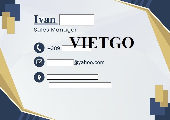 Ông Ivan là vị doanh nhân nghiêm túc, giàu kinh nghiệm và thiện chí. Ông đang nóng lòng mong đợi nhận được báo giá cũng như có cơ hội trao đổi thêm với các nhà cung cấp của VIETGO. Vì vậy, rất mong Quý nhà cung cấp quan tâm tới đơn hàng và có mong muốn hợp tác với ông Ivan có thể sớm liên lạc với ông qua thông tin dưới đây: